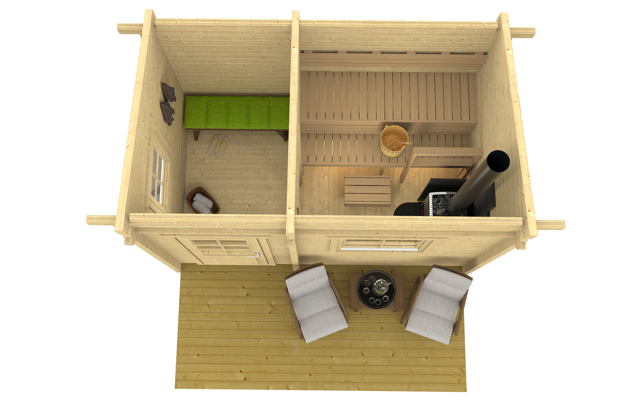 Valmissauna Moderni 12 pukuhuoneella ja etuterassilla